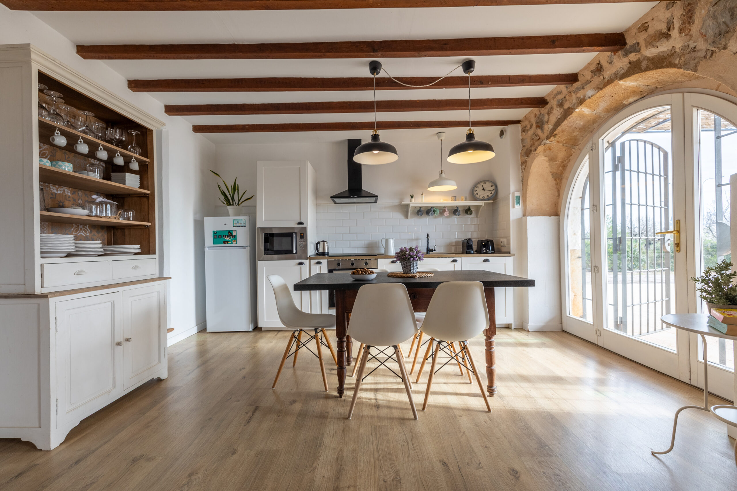 Al acceder a la vivienda, el ambiente acogedor del salón-comedor invita a disfrutar del espacio durante los meses de invierno gracias a la chimenea, y la cocina con acceso directo a la zona exterior es ideal y practica para disfrutar de los meses de verano.